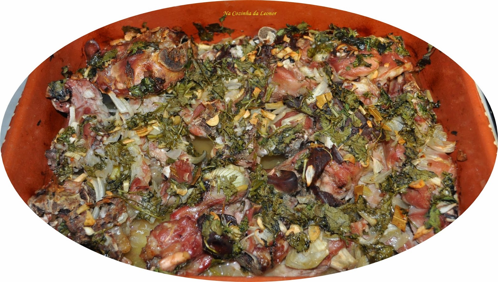 Num pyrex coloca-se o cabrito cortado em pedaços ( pedir no talho para cortar a carne).