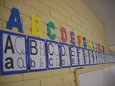 Um conjunto de letras do alfabeto em eva e mini cartazes com os quatro tipos de letras.