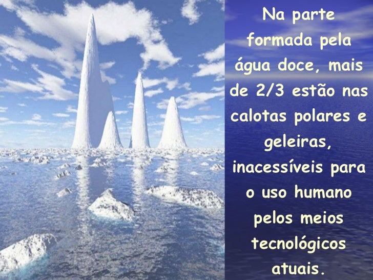 - 9. Na parte formada pela água doce, mais de 2/3 estão nas calotas polares e geleiras, inacessíveis para o uso humano pelos meios tecnológicos atuais.